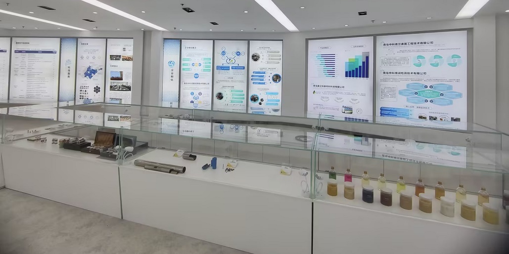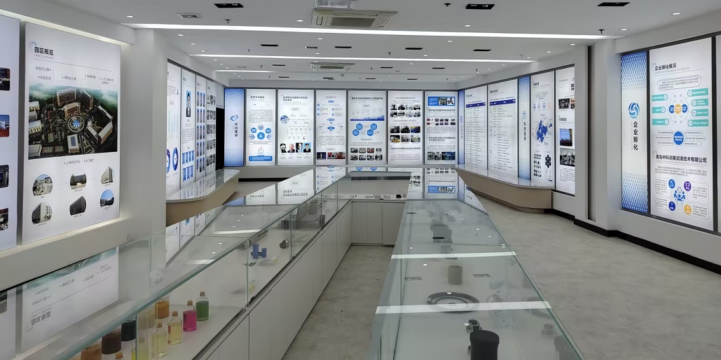 設(shè)計(jì)思路:蘭化所展館以白色為主基調(diào),輔以淺藍(lán)色點(diǎn)綴,營(yíng)造清新、明亮的展示環(huán)境。墻面采用白色,搭配淺藍(lán)色裝飾條和展示架,凸顯蘭化所的科技感和未來感。