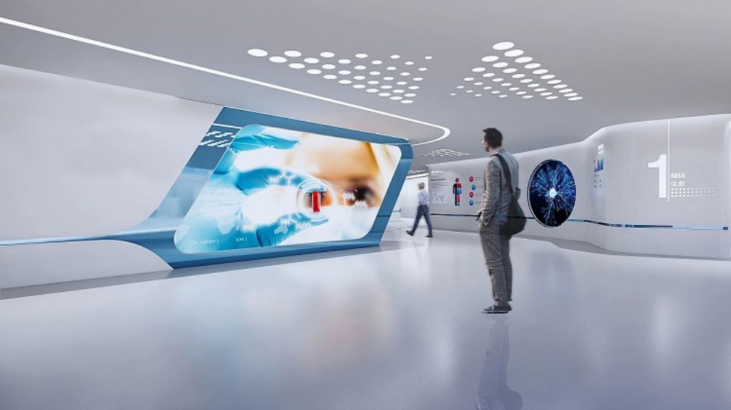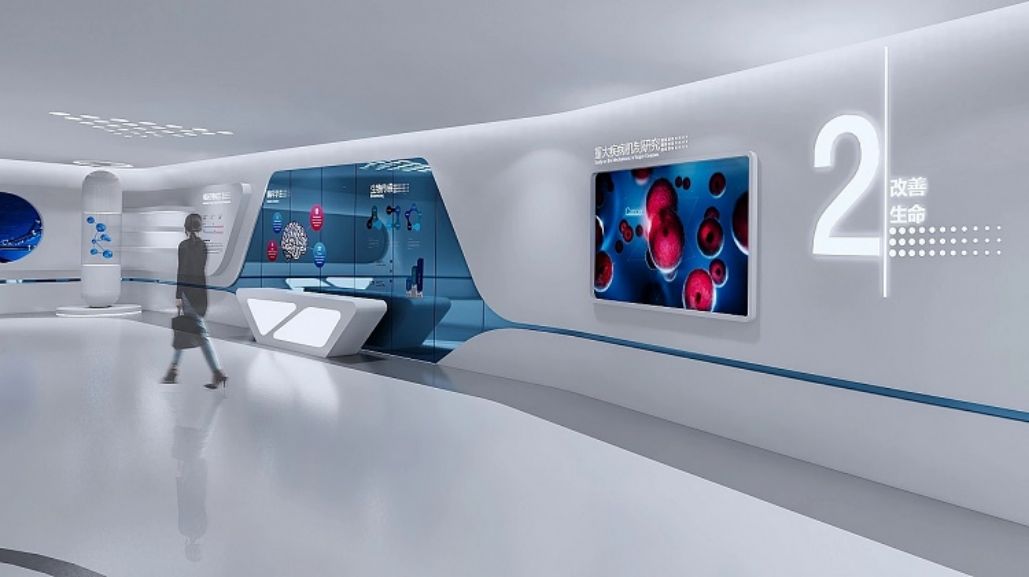 城市:山東菏澤,時(shí)間:2020年6月-9月。設(shè)計(jì)理念:展廳布局簡(jiǎn)潔,白色為主,藍(lán)色點(diǎn)綴,聲光電演繹生命奧秘,展示企業(yè)細(xì)胞生命科技實(shí)力。