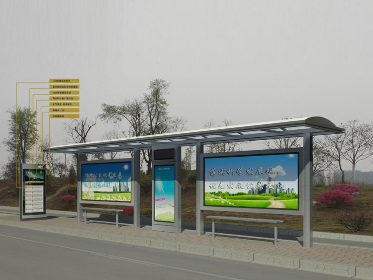 公交車候車亭一般是與公交站牌相配套的,為方便公交乘客候車時(shí)遮陽(yáng)、防雨等,在車站、道路兩旁或綠化帶的港灣式公交停靠站上建設(shè)的交通設(shè)施。由于城市公交的日益發(fā)達(dá),候車亭已發(fā)展成為城市一個(gè)不可或缺的重要組成部分,設(shè)計(jì)精美的候車亭也成為了城市一道美麗的風(fēng)景。 一般候車亭棚體主要頂棚、立柱、頂弓、廣告燈箱和坐凳組成,也有用隔板來(lái)代替廣告燈箱的。